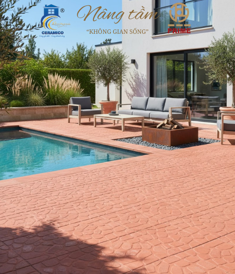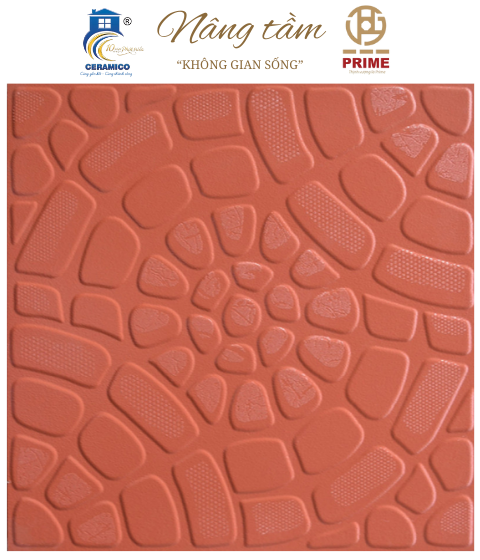 Thiết kế: Bề mặt định hình họa tiết sỏi tròn đồng tâm, tông màu đỏ đất nung truyền thống.