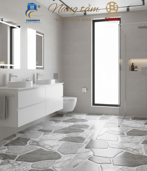 Họa tiết: Giả đá tự nhiên đa sắc (cẩm thạch, granite) phối kiểu mosaic ngẫu nhiên, tạo điểm nhấn phá cách.
