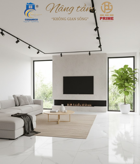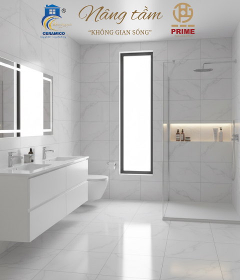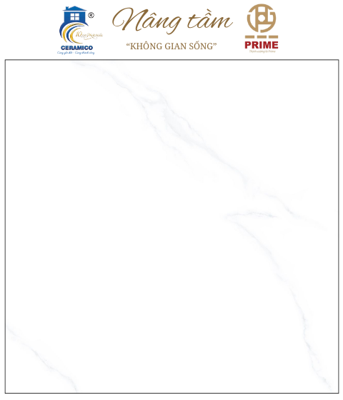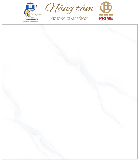 Sản phẩm: Gạch Porcelain trắng bóng với vân mây xám nhạt, tạo vẻ đẹp tinh khôi và mở rộng không gian.