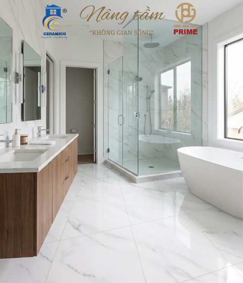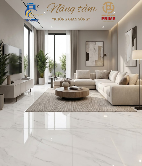 Điểm nhấn đắt giá: Họa tiết vân đá sắc sảo như những nét ký họa nghệ thuật, tôn lên vẻ sang trọng và gu thẩm mỹ riêng biệt của gia chủ. Hiệu ứng pha lê: Lớp men kính dày dặn giúp sàn nhà lấp lánh như được dát một lớp đá quý, thu hút mọi ánh nhìn ngay từ lần chạm mắt đầu tiên.