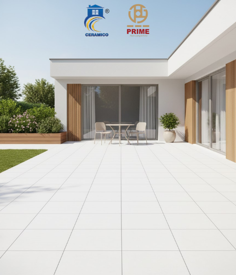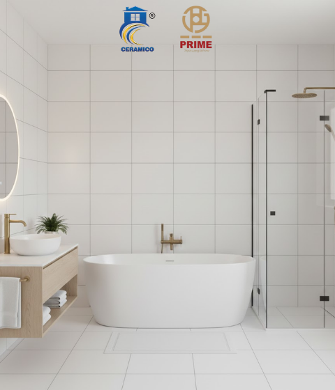 Sản phẩm: Gạch Porcelain cao cấp tông màu trắng sáng tinh khôi, bề mặt mờ mịn giúp tối ưu hóa ánh sáng tự nhiên và mang lại cảm giác sạch sẽ, thoáng đãng.