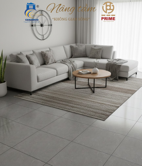 Sản phẩm: Gạch Porcelain cao cấp với tông màu trung tính (kem, xám) và họa tiết vân đá/xi măng tinh tế.