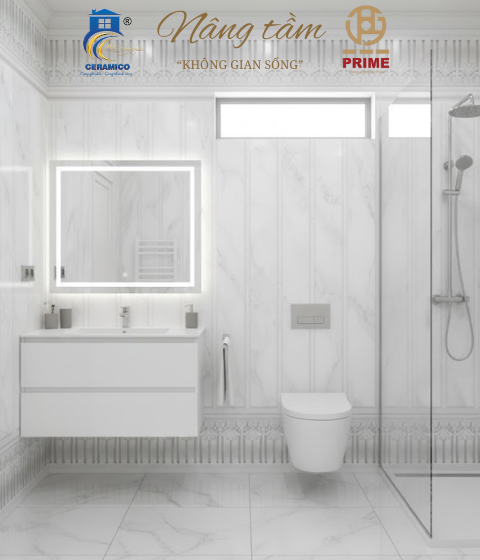 Thiết kế: Họa tiết vân đá marble trắng phối thanh nan (vách ngăn) tạo chiều sâu sang trọng và hiện đại.