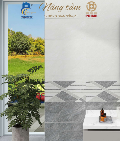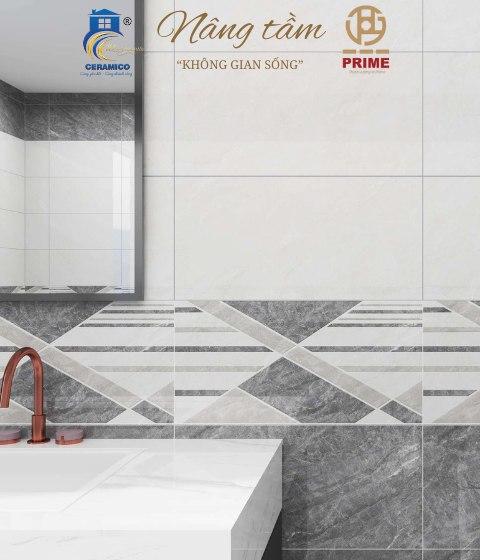Bố cục ba phần hiện đại: Bộ gạch được chia thành viên trắng xám nhạt ở trên, viên trang trí ở giữa và viên xám đậm bên dưới, tạo nên sự phân tầng cân đối cho bức tường.