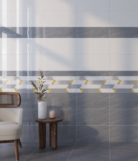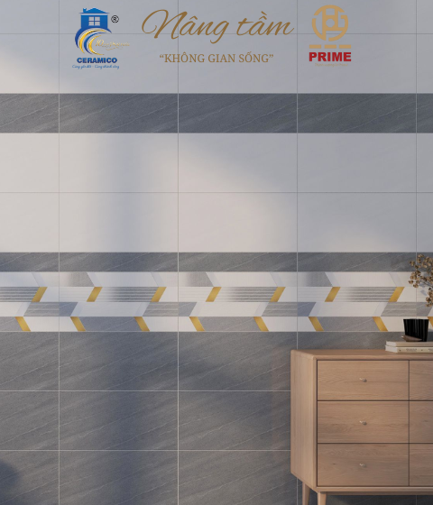 Bố cục ba phần đối lập: Bộ gạch kết hợp giữa viên trắng xám nhạt phía trên, viên trang trí ở giữa và viên xám đậm bên dưới, tạo nên cấu trúc phân tầng rõ rệt.