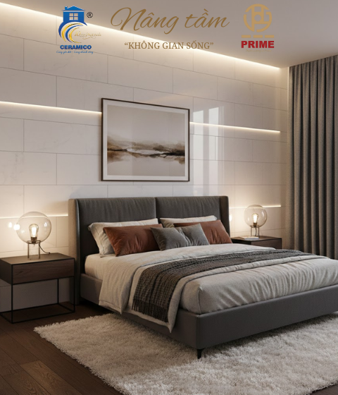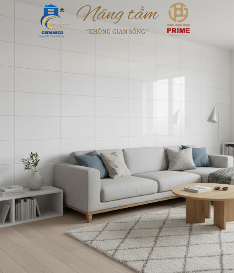 Sắc trắng tinh khôi: Gạch có tông màu trắng sáng đồng nhất, giúp không gian phòng khách trở nên rộng rãi, sạch sẽ và hiện đại hơn.
