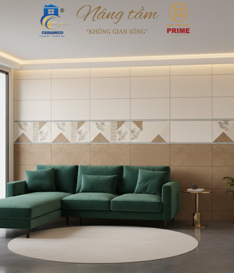 Bố cục ba phần rõ rệt: Thiết kế gồm viên màu sáng phía trên, viên hoa văn ở giữa làm điểm nhấn và viên nâu đậm bên dưới tạo sự vững chãi cho chân tường.