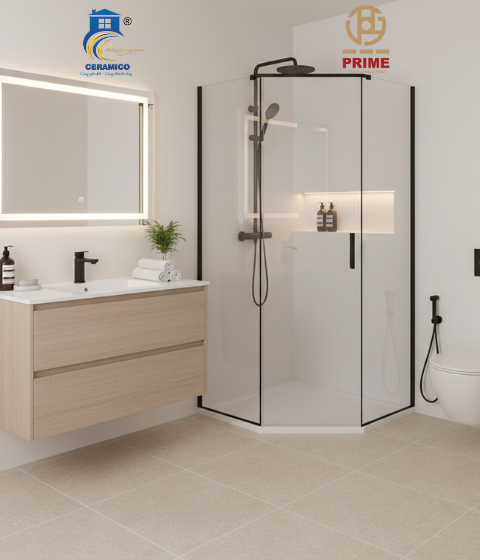 Thẩm mỹ: Tông màu kem trang nhã, họa tiết giả đá mịn tạo cảm giác ấm cúng và rộng rãi.