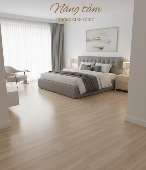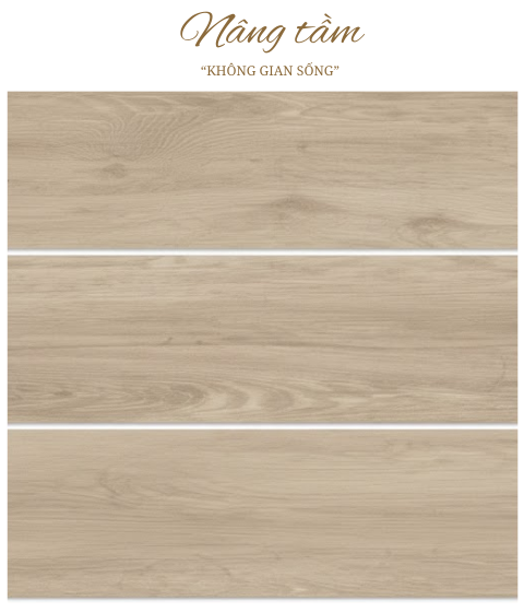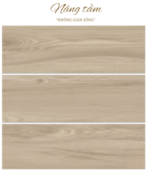 Vân gỗ tự nhiên: Bề mặt gạch mô phỏng các đường vân gỗ sồi mềm mại và chân thực.