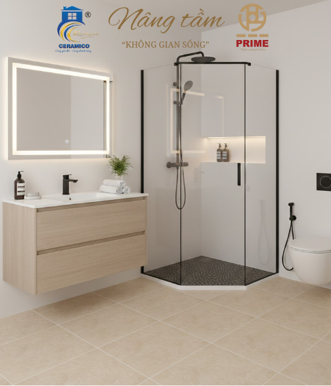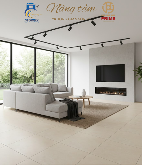 Sản phẩm: Gạch Porcelain khổ lớn, tông màu kem trung tính với bề mặt mờ (matt) sang trọng.