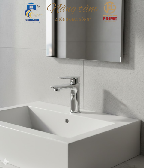Thiết kế tối ưu cho chậu có lỗ cắm vòi: Thân thấp phù hợp lắp trực tiếp lên sứ, giúp tiết kiệm diện tích và tạo sự gọn gàng.